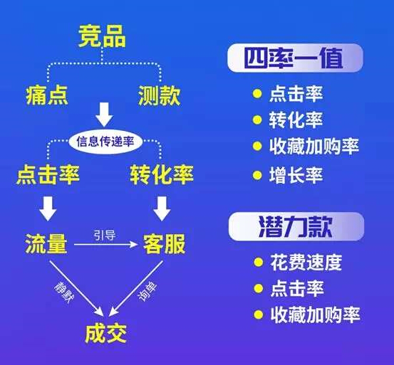 一款宝贝表现是否优秀,直接的表现就是“四率一值”,分别是点击率,转化率,收藏加购率,增长率及UV价值。