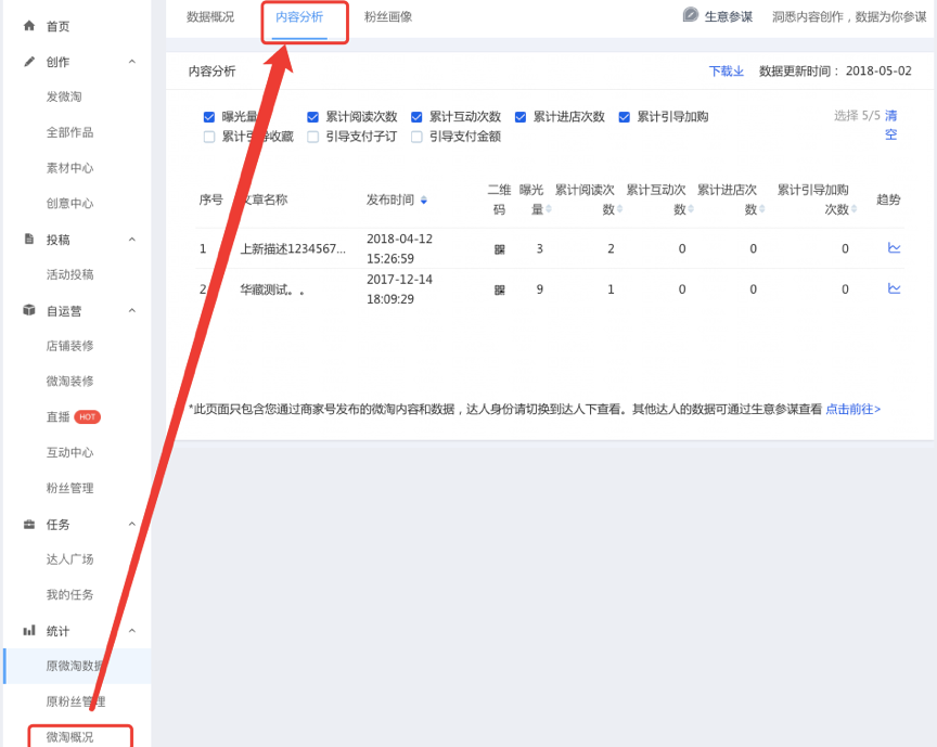 商家可在阿里创作平台左侧栏“微淘概况-内容分析”中,根据转发时间找到自己所转发的那条内容,然后查看相关数据。